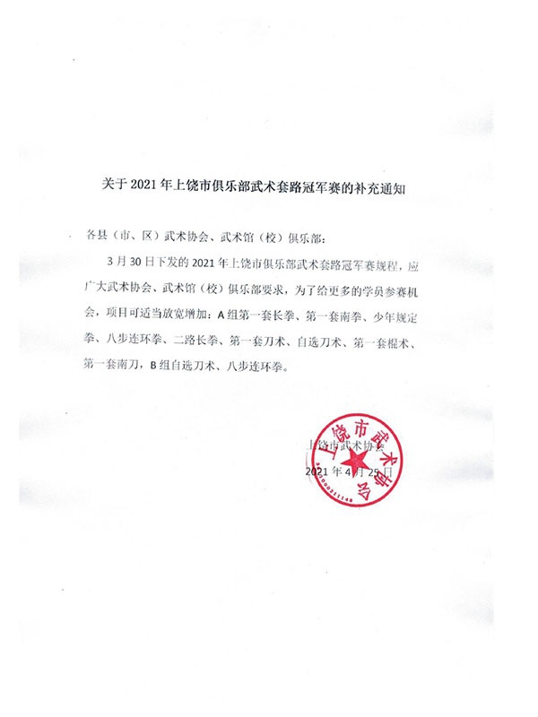 中华人民共和国第二届青年运动会武术套路决赛(社会俱乐部组) 补充事宜的函